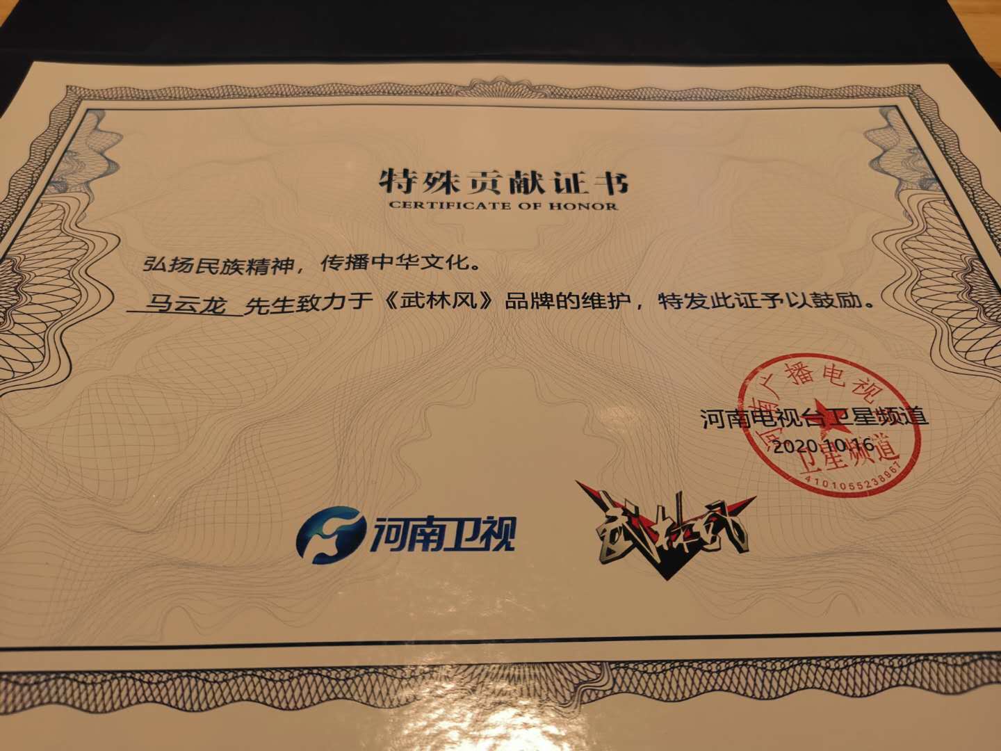 公元2020年10月16日,河南广播电视台暨河南卫视武林风领导在节目录制现场为马云龙颁发【特殊贡献证书】。