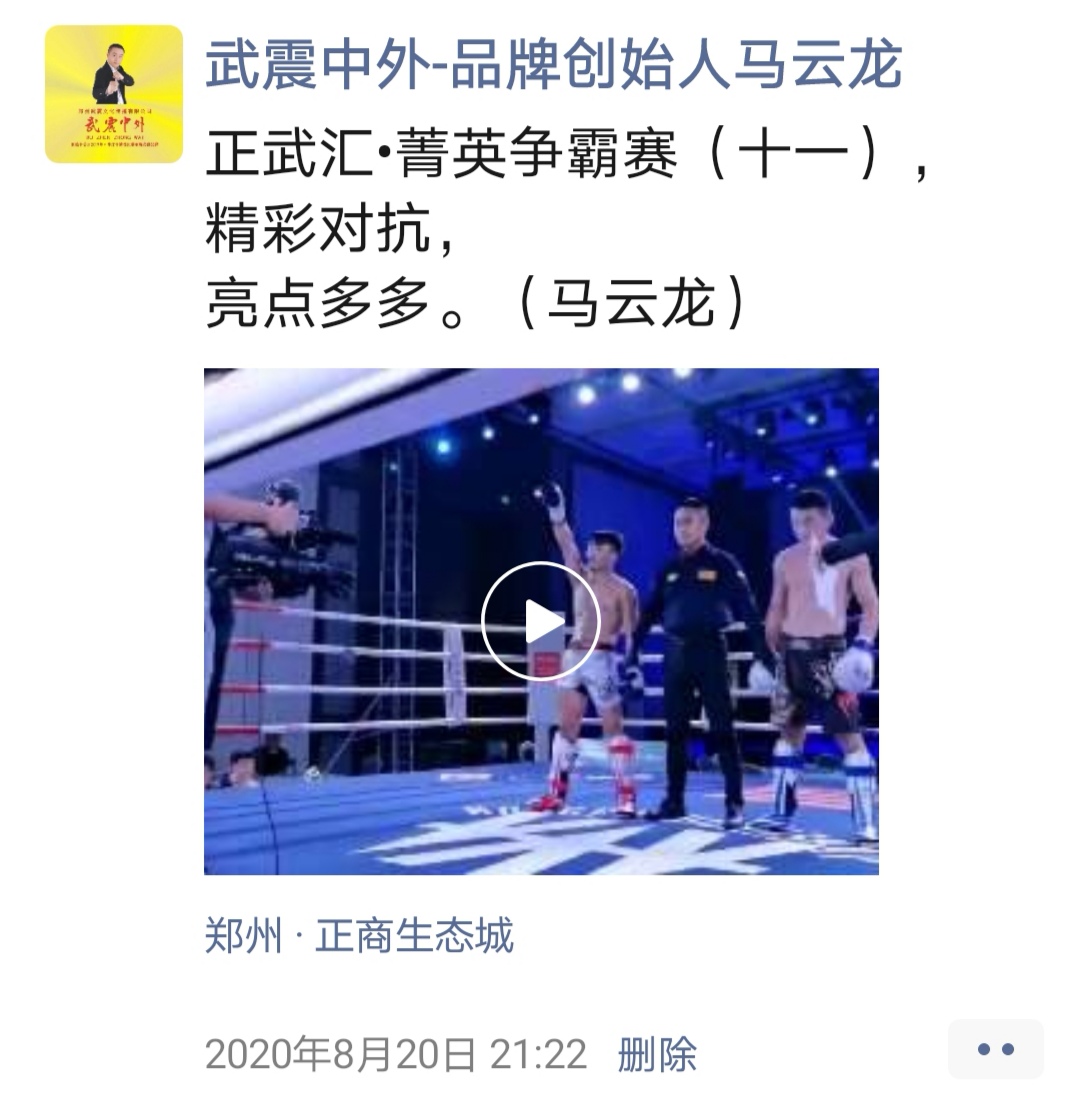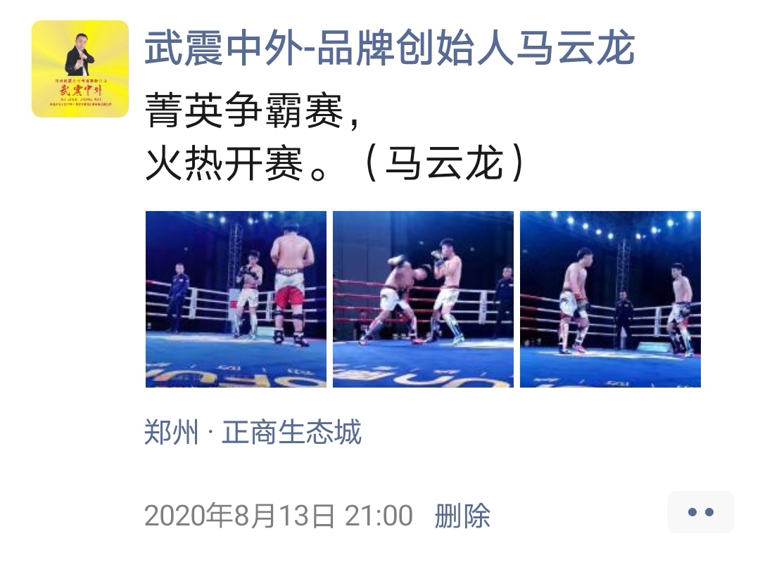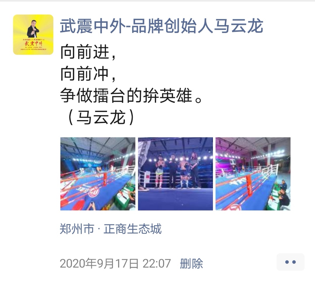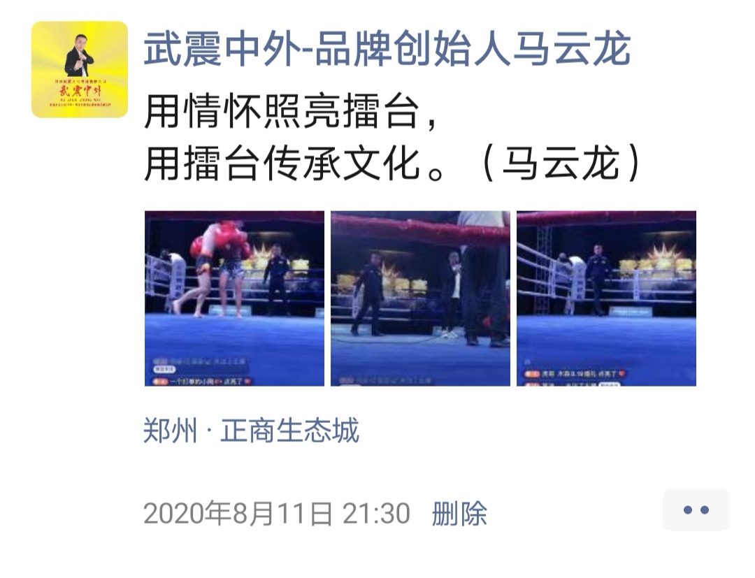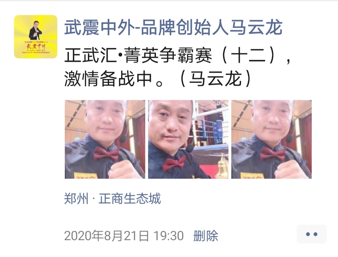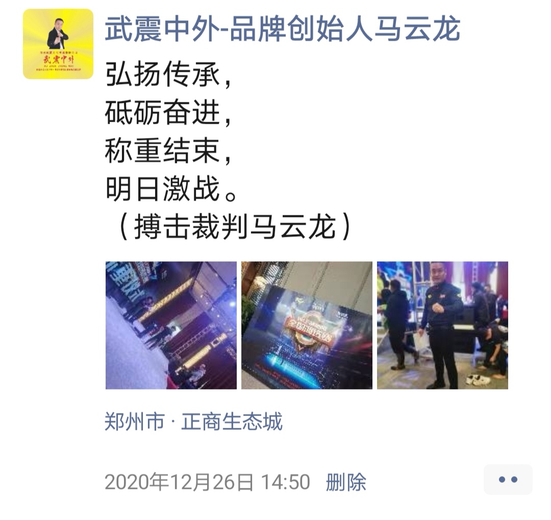 如:【武震中外】品牌创始人马云龙,除了本公司的工作之外,也积极参与国内其它品牌赛事,作为各路品牌各地赛事的裁判一员,从2019年5月至2020年12月之间,马云龙陆续参与执裁各路品牌赛事,已达三百三十场左右,参与执裁每地举办的赛事时,马云龙都很珍惜宝贵的精彩瞬间而及时的记录着,精彩回顾,如图: