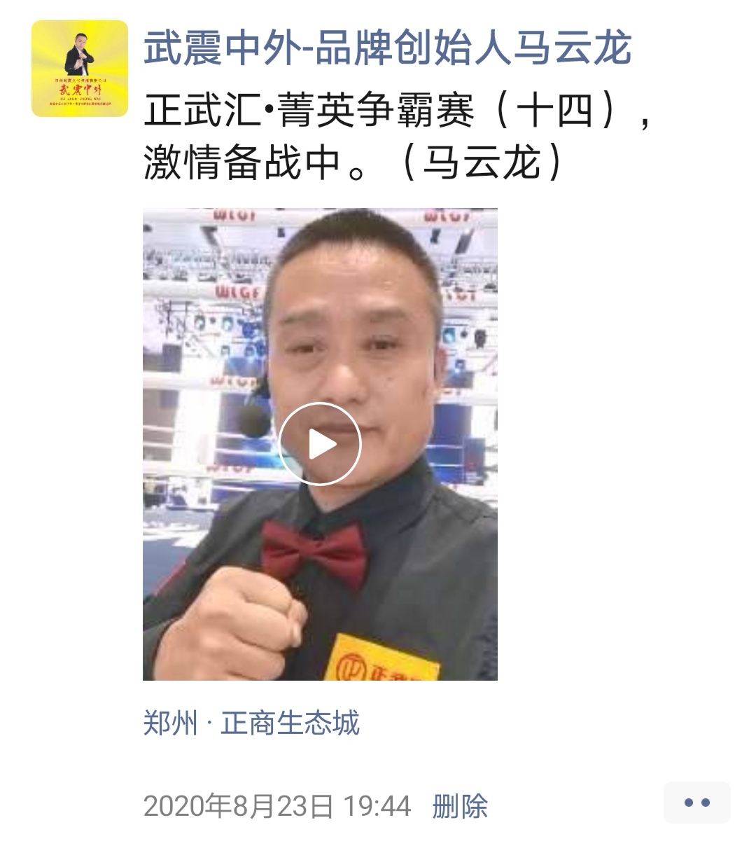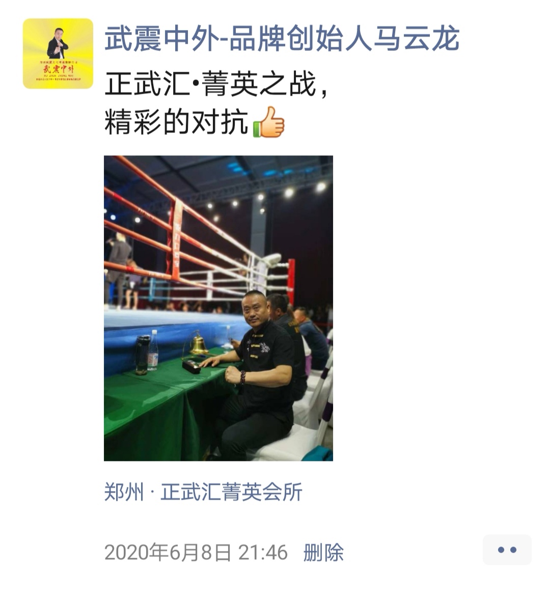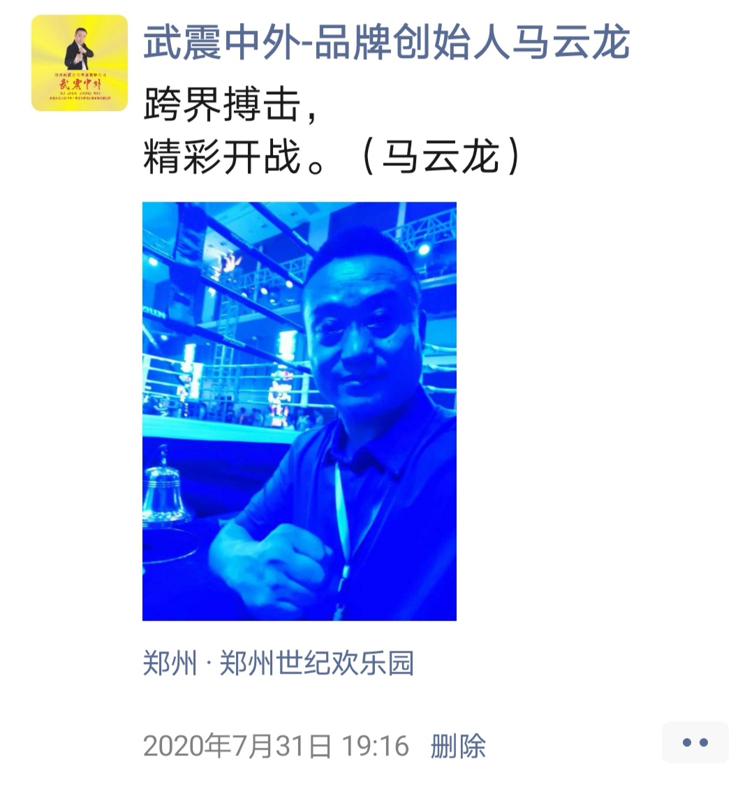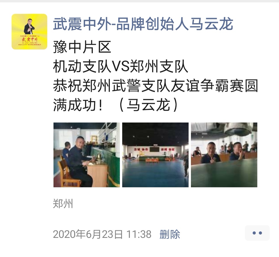 如:【武震中外】品牌创始人马云龙,除了本公司的工作之外,也积极参与国内其它品牌赛事,作为各路品牌各地赛事的裁判一员,从2019年5月至2020年12月之间,马云龙陆续参与执裁各路品牌赛事,已达三百三十场左右,参与执裁每地举办的赛事时,马云龙都很珍惜宝贵的精彩瞬间而及时的记录着,精彩回顾,如图: