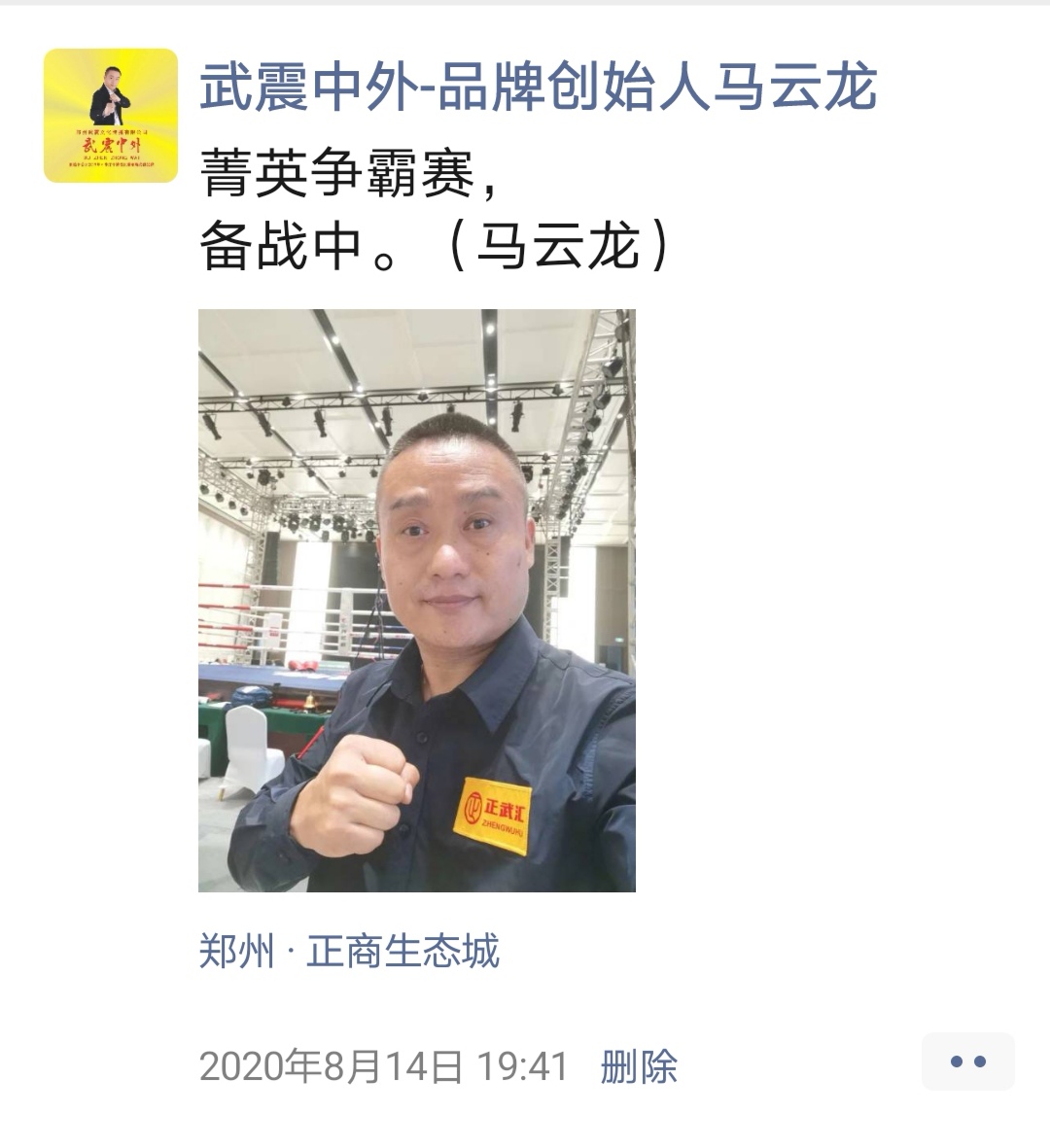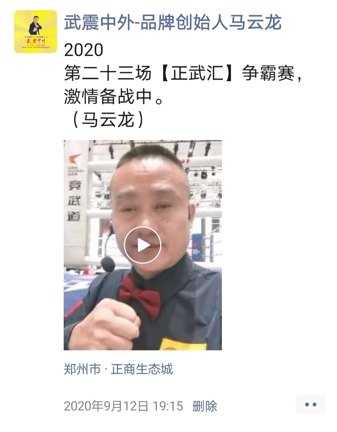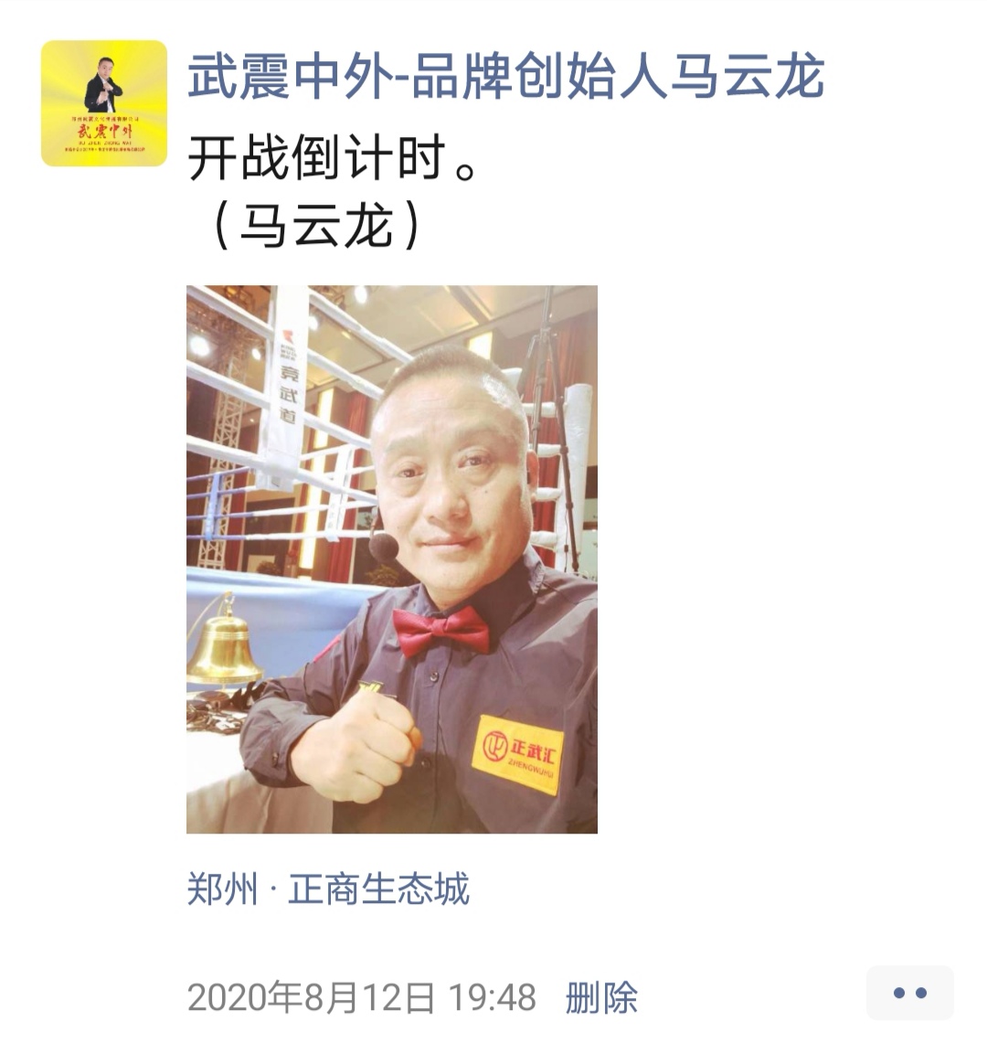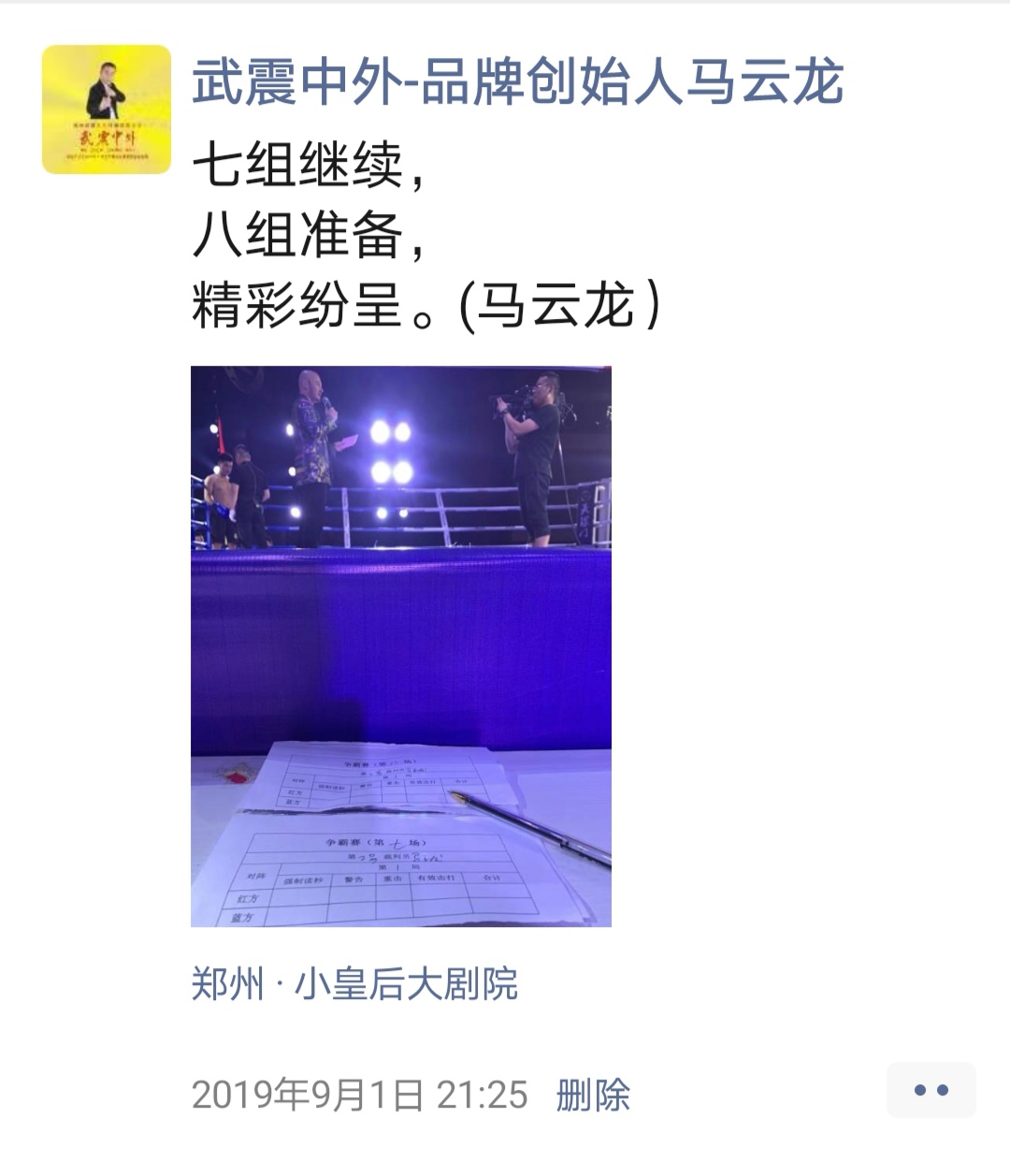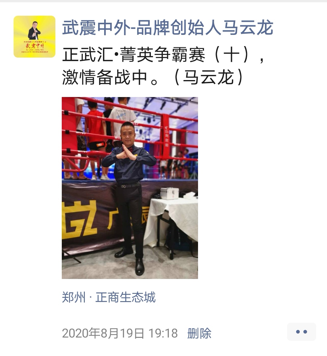 如:【武震中外】品牌创始人马云龙,除了本公司的工作之外,也积极参与国内其它品牌赛事,作为各路品牌各地赛事的裁判一员,从2019年5月至2020年12月之间,马云龙陆续参与执裁各路品牌赛事,已达三百三十场左右,参与执裁每地举办的赛事时,马云龙都很珍惜宝贵的精彩瞬间而及时的记录着,精彩回顾,如图: