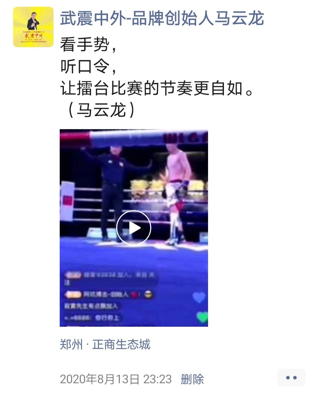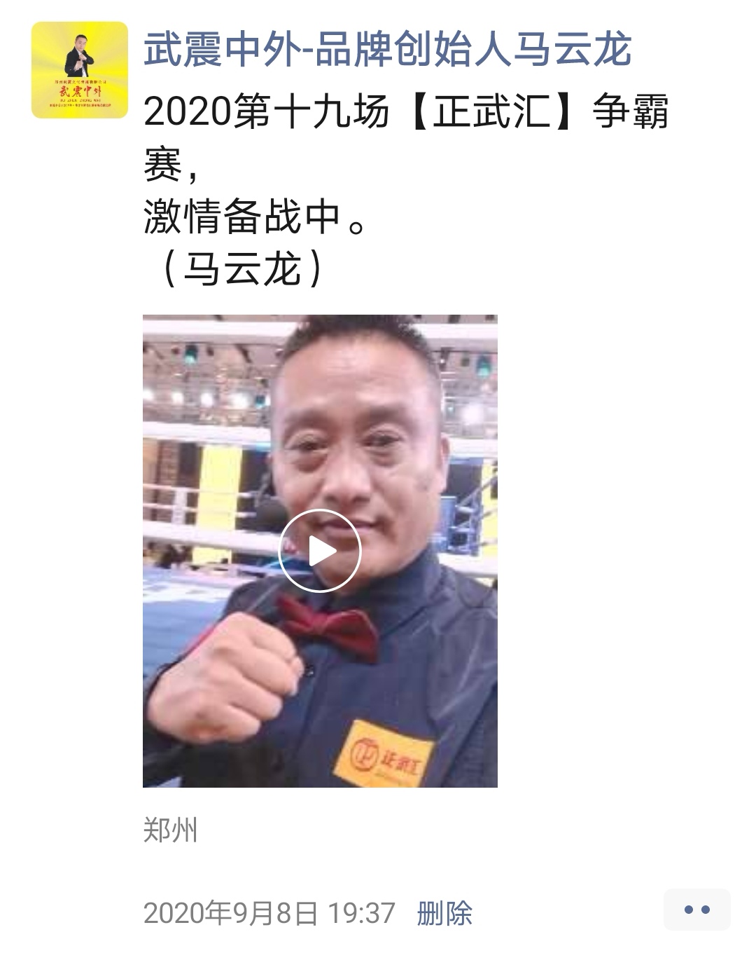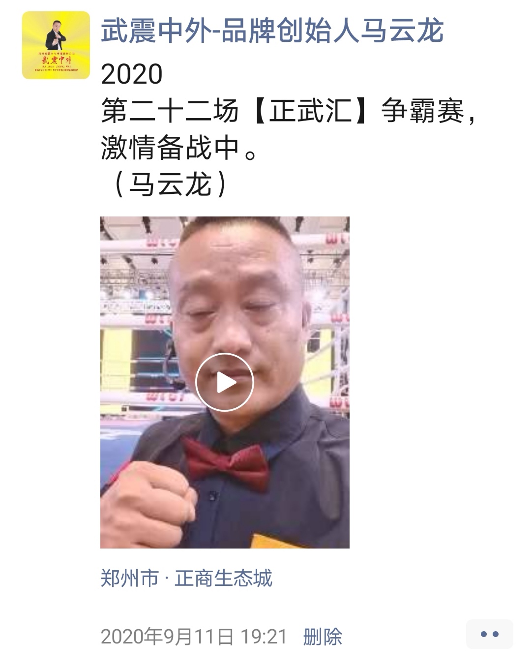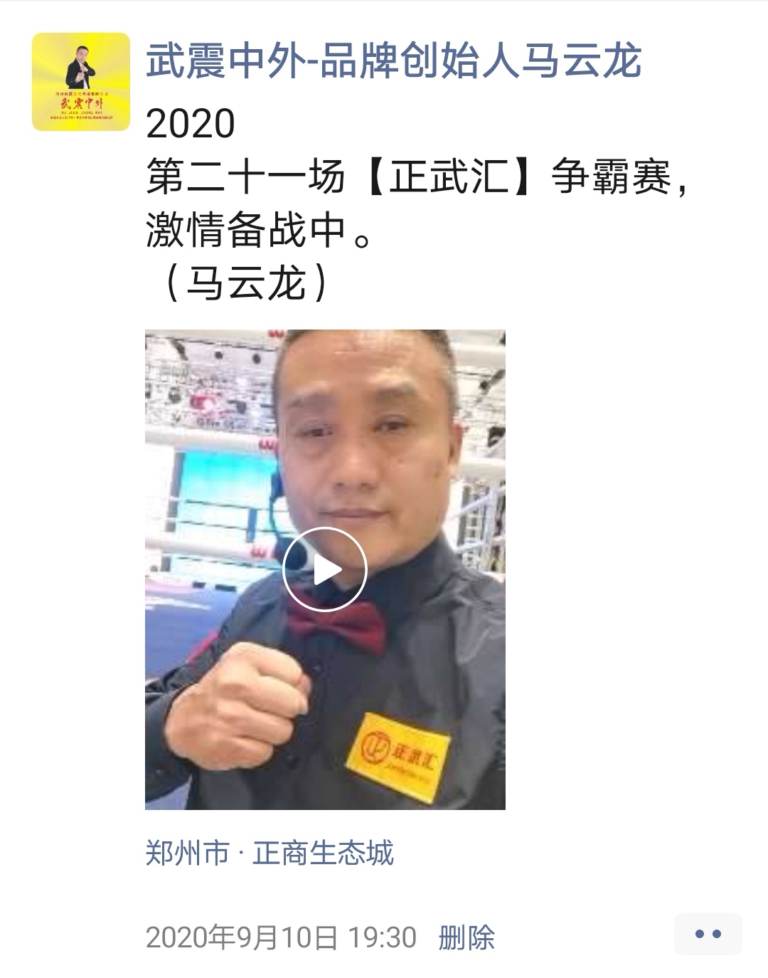 如:【武震中外】品牌创始人马云龙,除了本公司的工作之外,也积极参与国内其它品牌赛事,作为各路品牌各地赛事的裁判一员,从2019年5月至2020年12月之间,马云龙陆续参与执裁各路品牌赛事,已达三百三十场左右,参与执裁每地举办的赛事时,马云龙都很珍惜宝贵的精彩瞬间而及时的记录着,精彩回顾,如图: