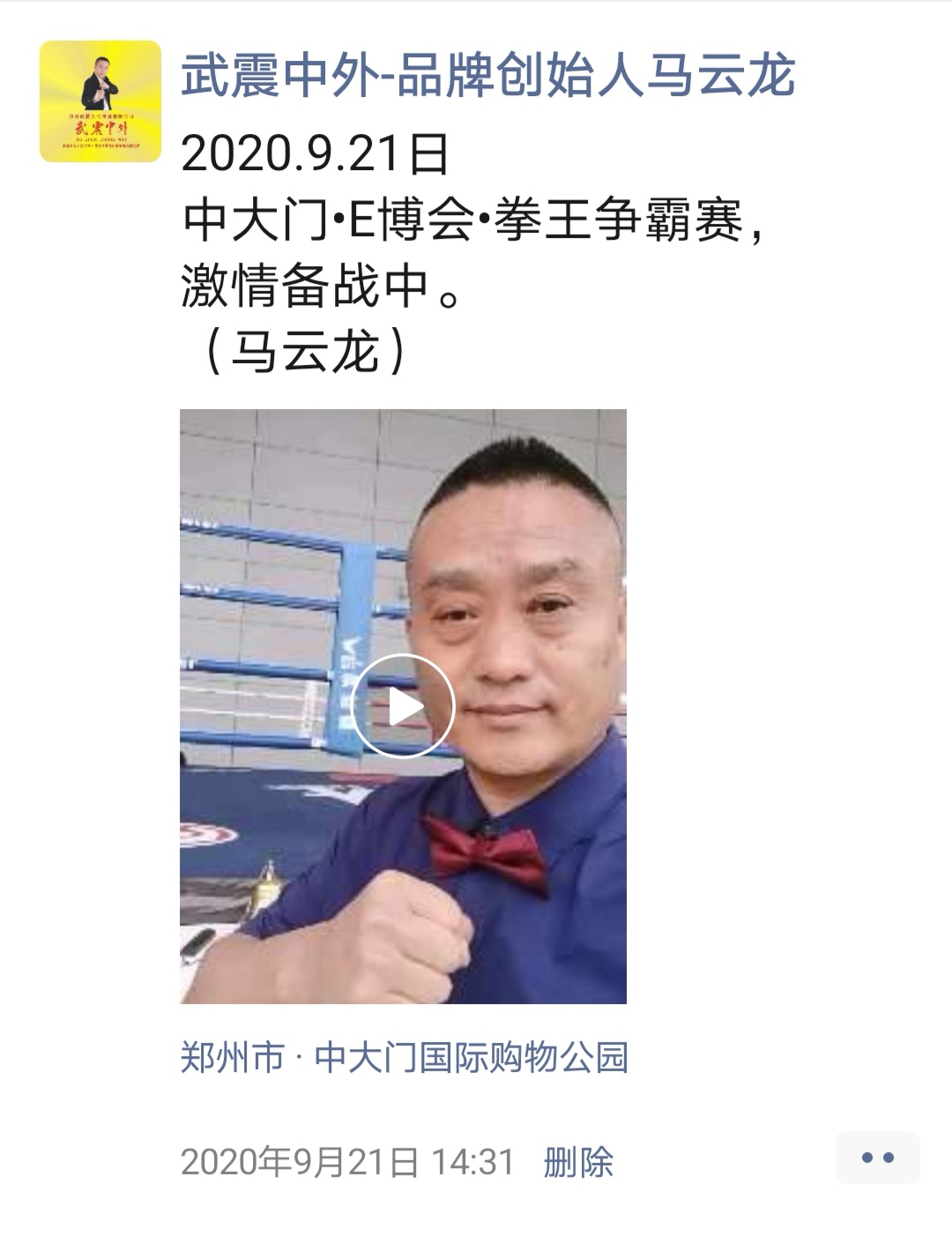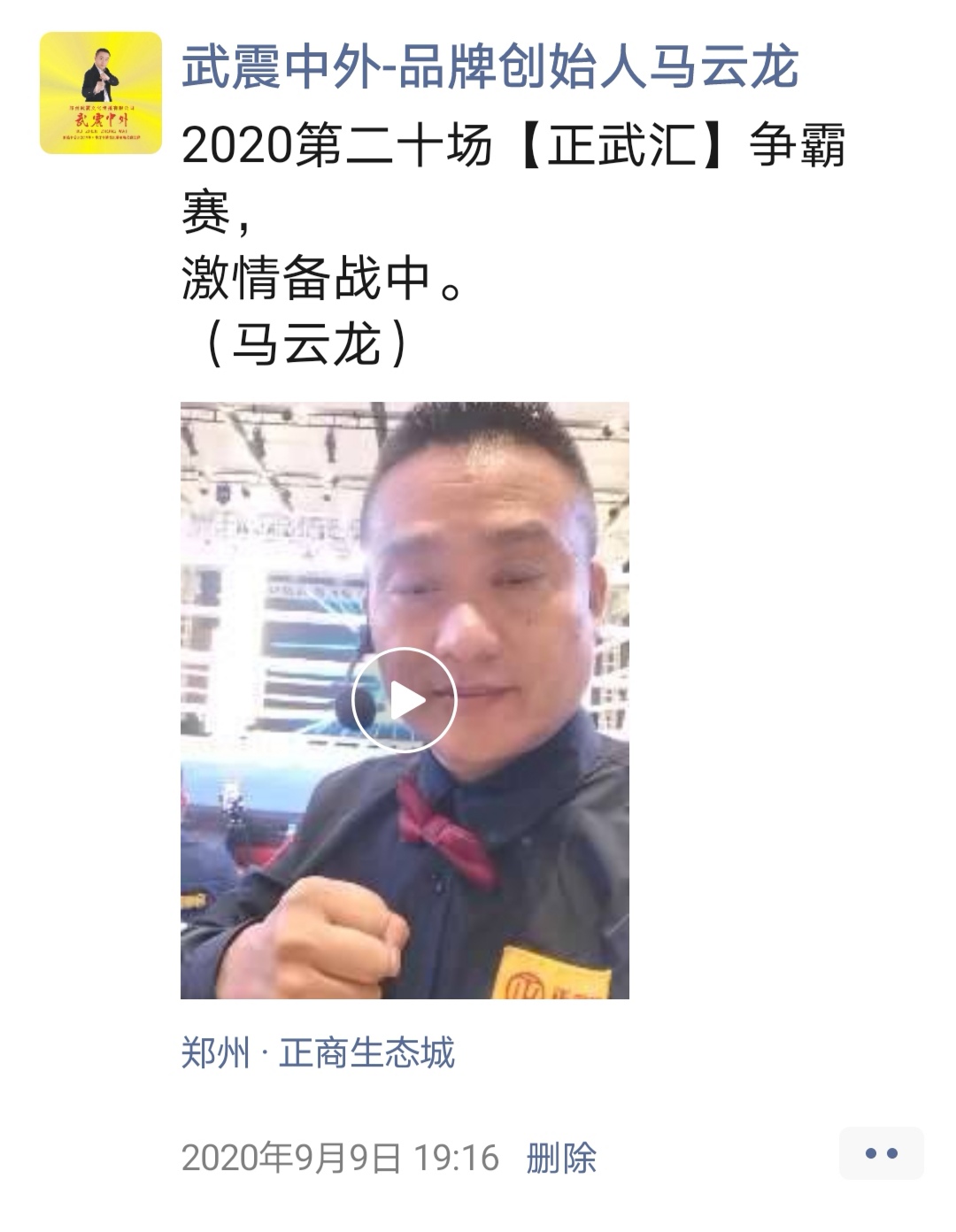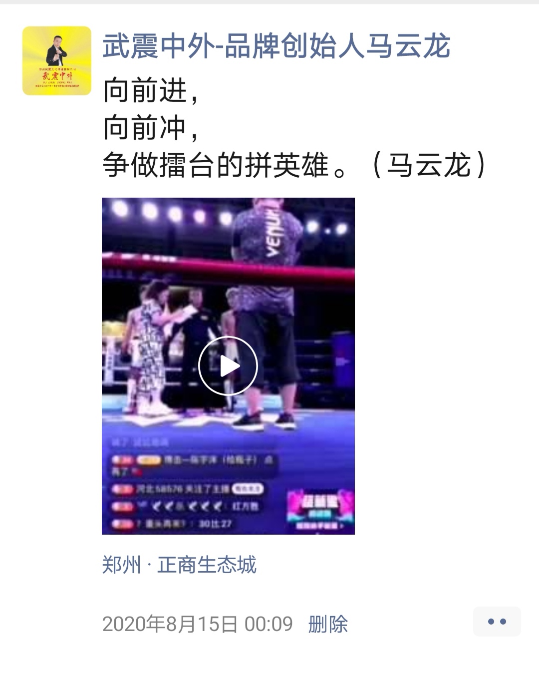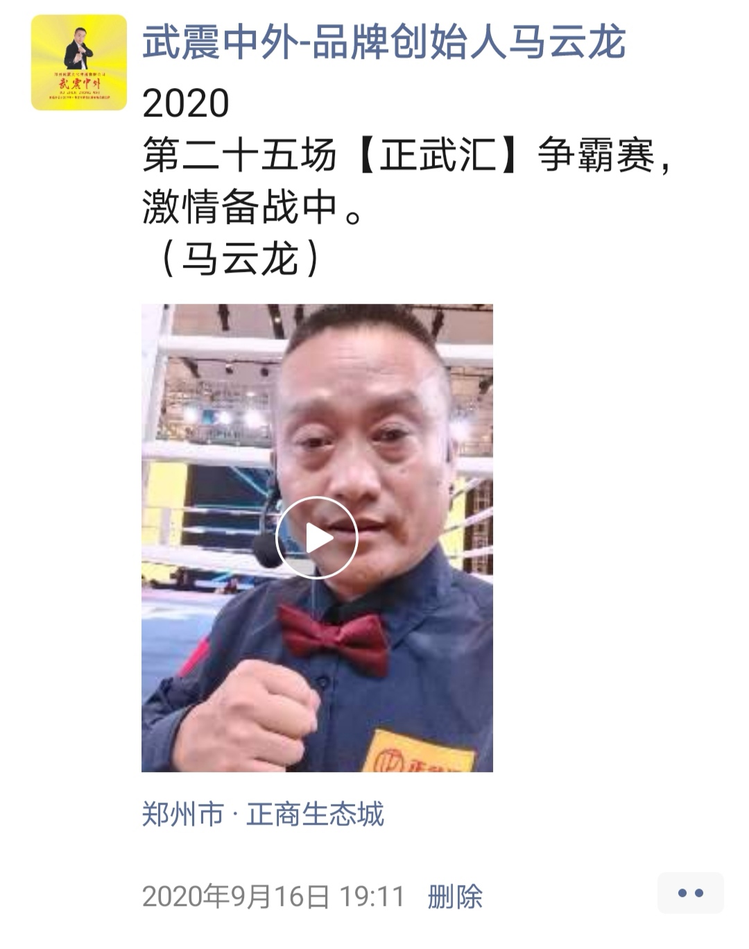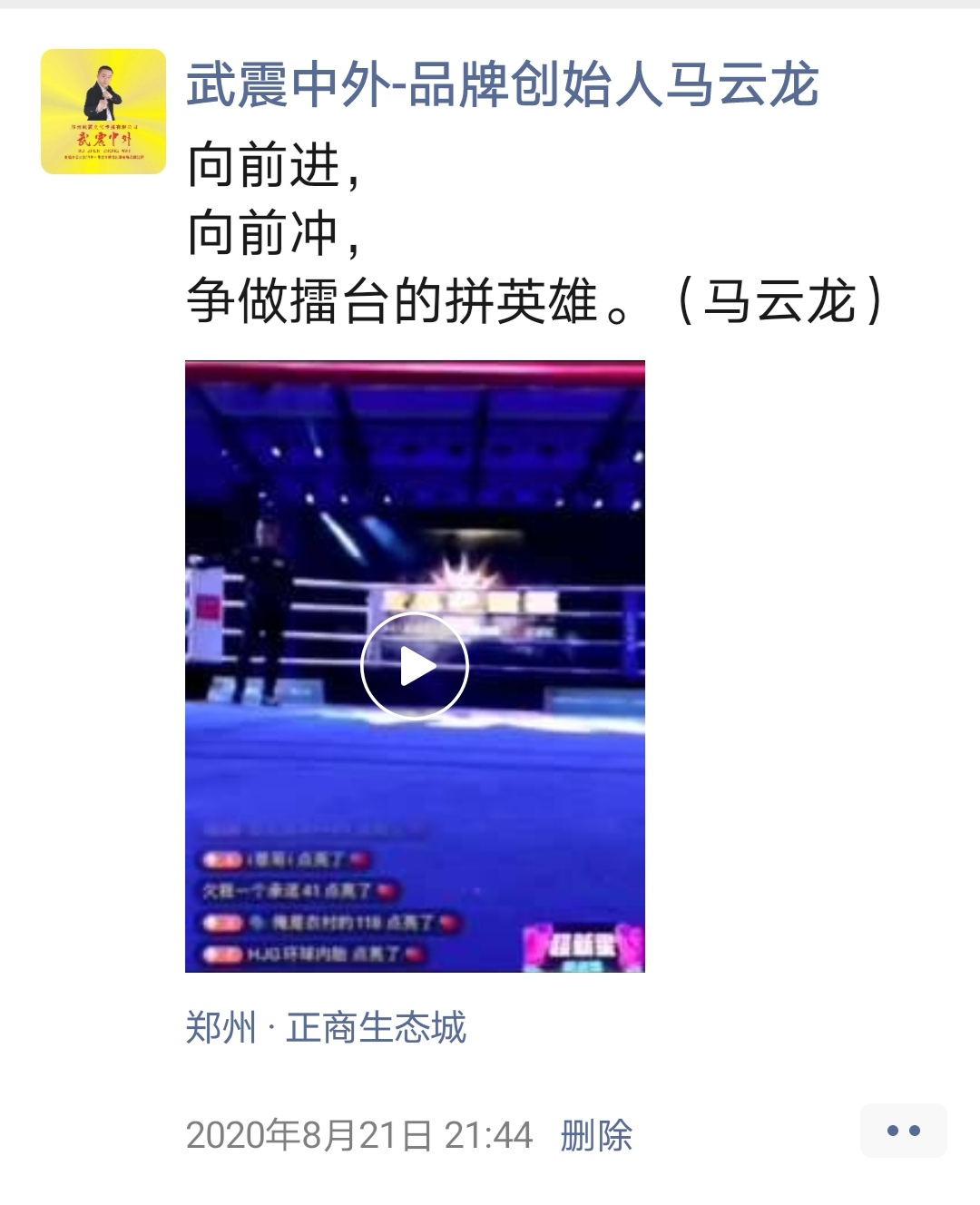 如:【武震中外】品牌创始人马云龙,除了本公司的工作之外,也积极参与国内其它品牌赛事,作为各路品牌各地赛事的裁判一员,从2019年5月至2020年12月之间,马云龙陆续参与执裁各路品牌赛事,已达三百三十场左右,参与执裁每地举办的赛事时,马云龙都很珍惜宝贵的精彩瞬间而及时的记录着,精彩回顾,如图:
