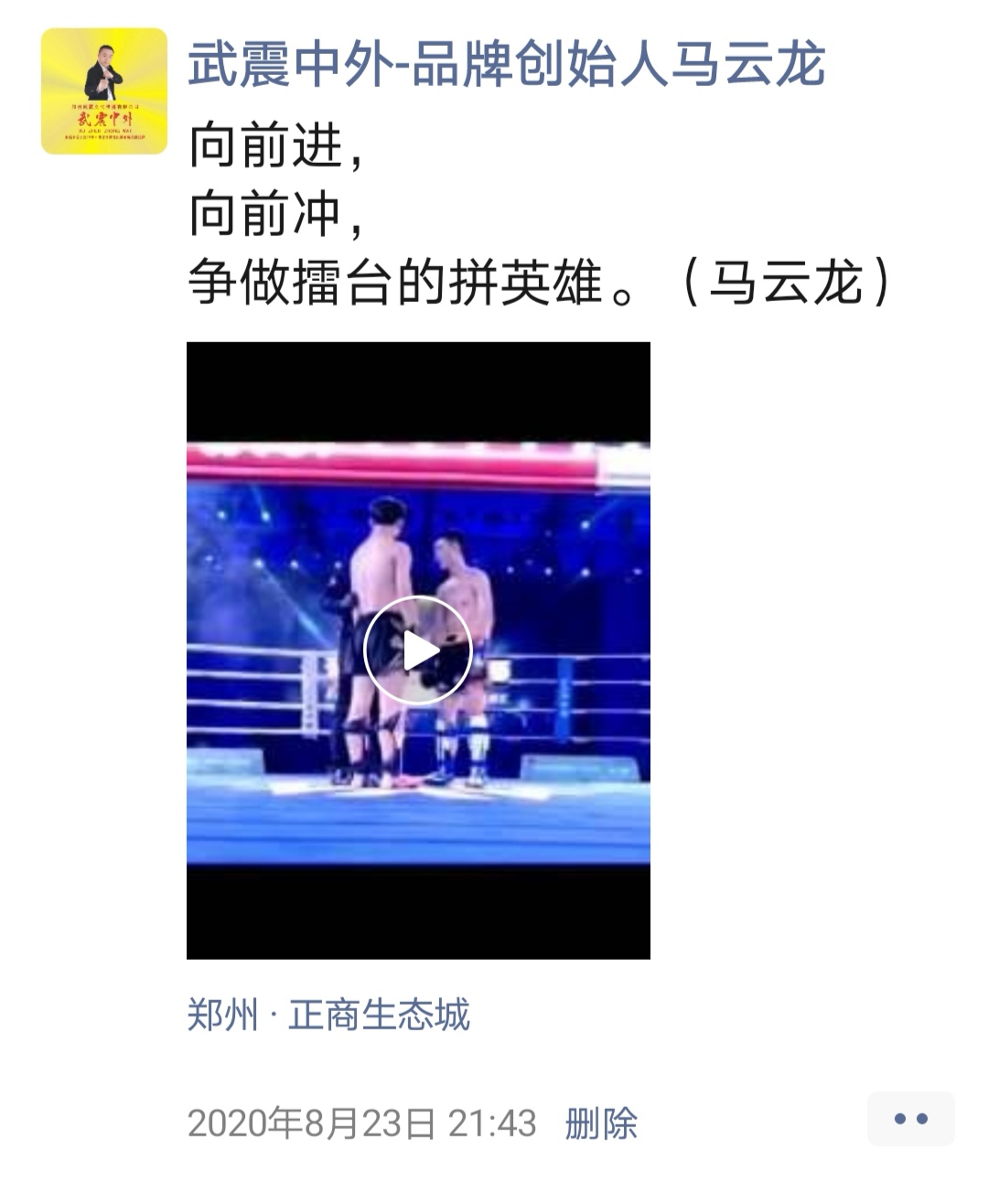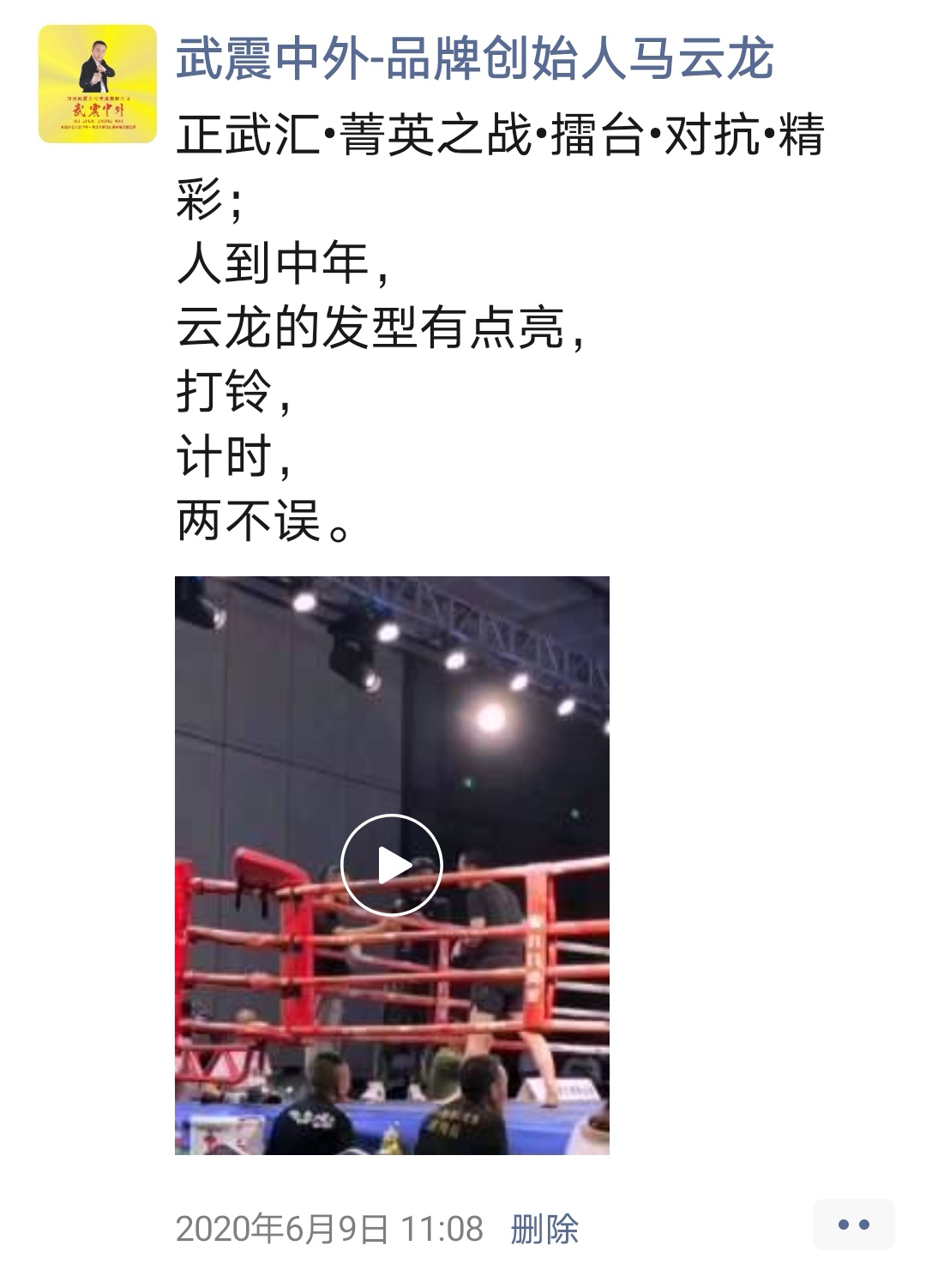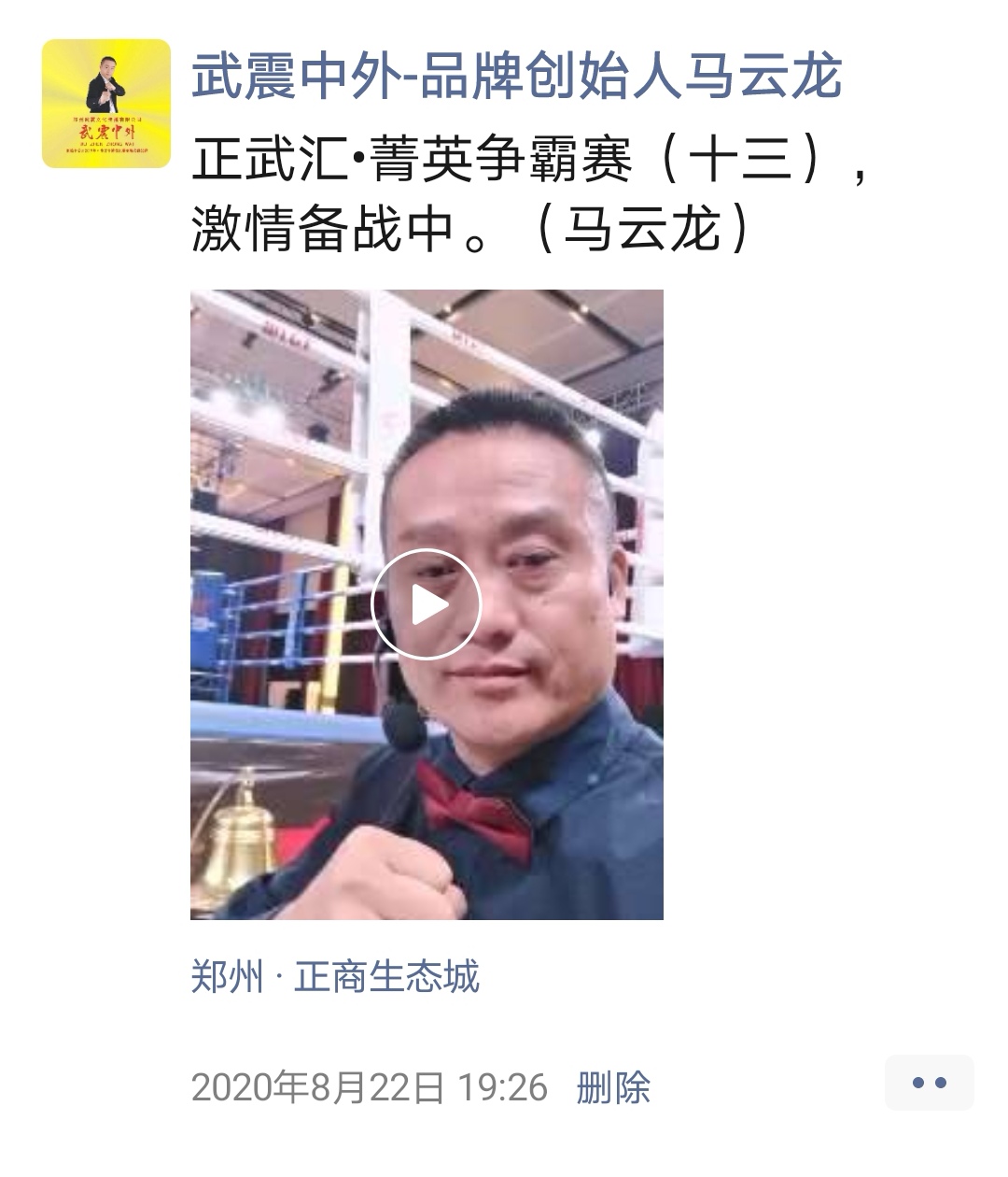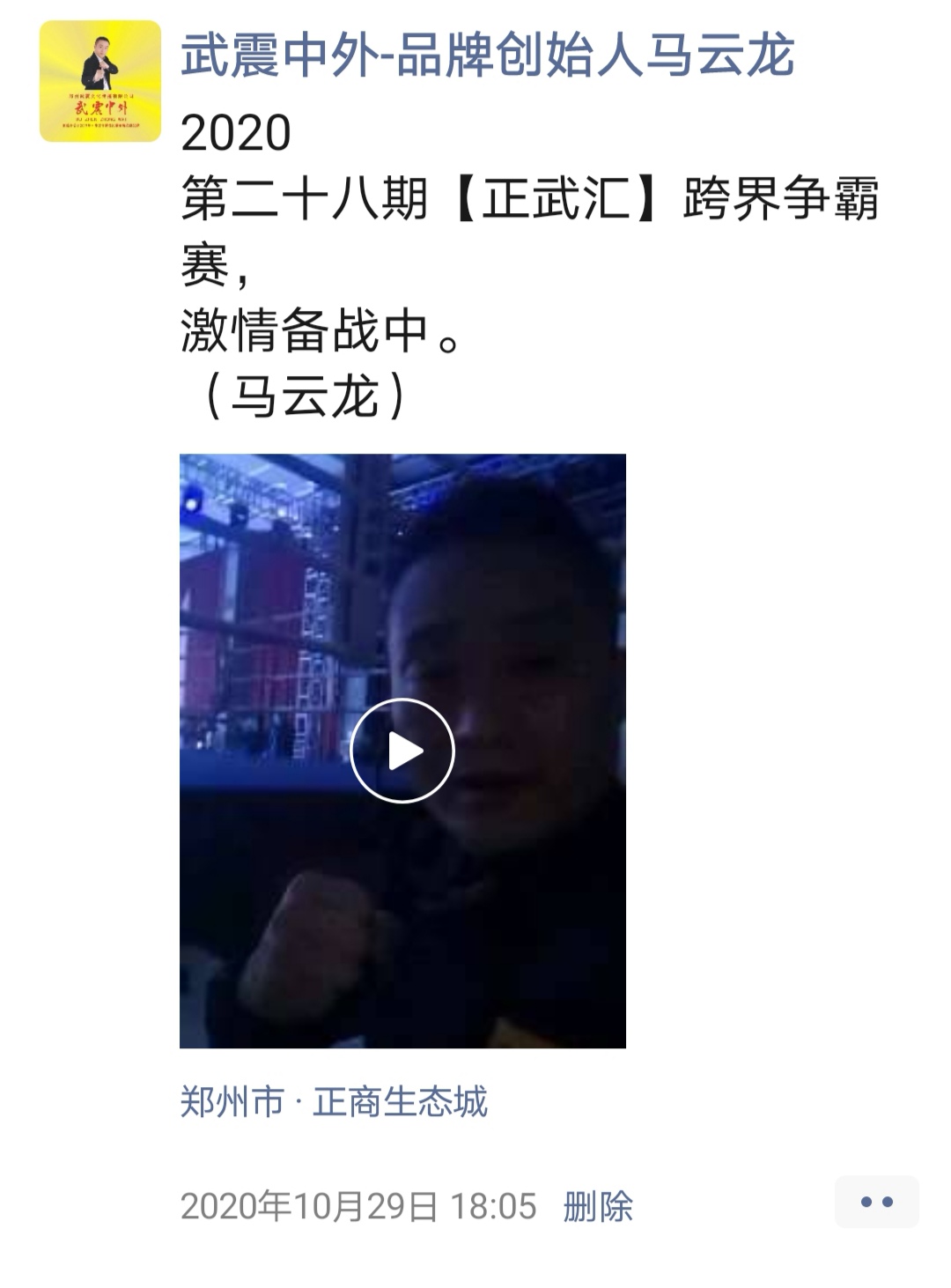 如:【武震中外】品牌创始人马云龙,除了本公司的工作之外,也积极参与国内其它品牌赛事,作为各路品牌各地赛事的裁判一员,从2019年5月至2020年12月之间,马云龙陆续参与执裁各路品牌赛事,已达三百三十场左右,参与执裁每地举办的赛事时,马云龙都很珍惜宝贵的精彩瞬间而及时的记录着,精彩回顾,如图: