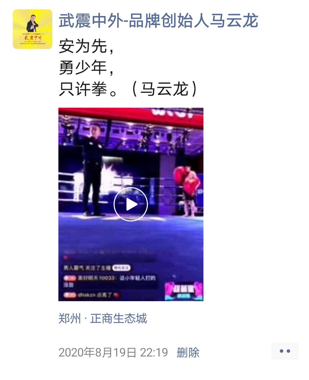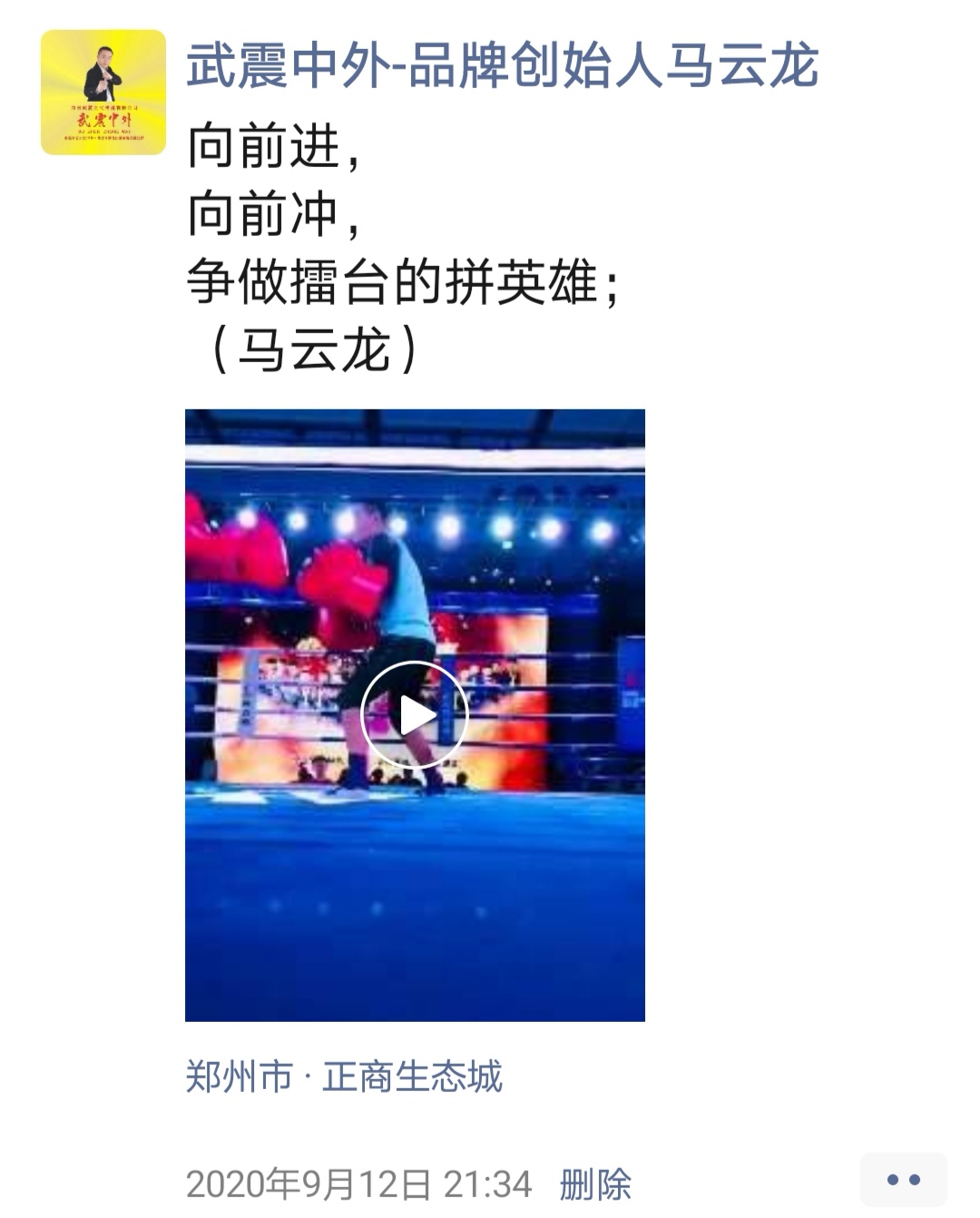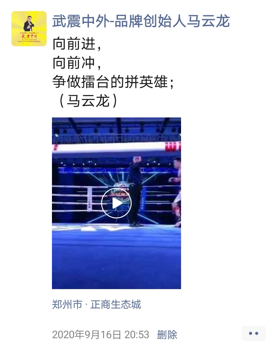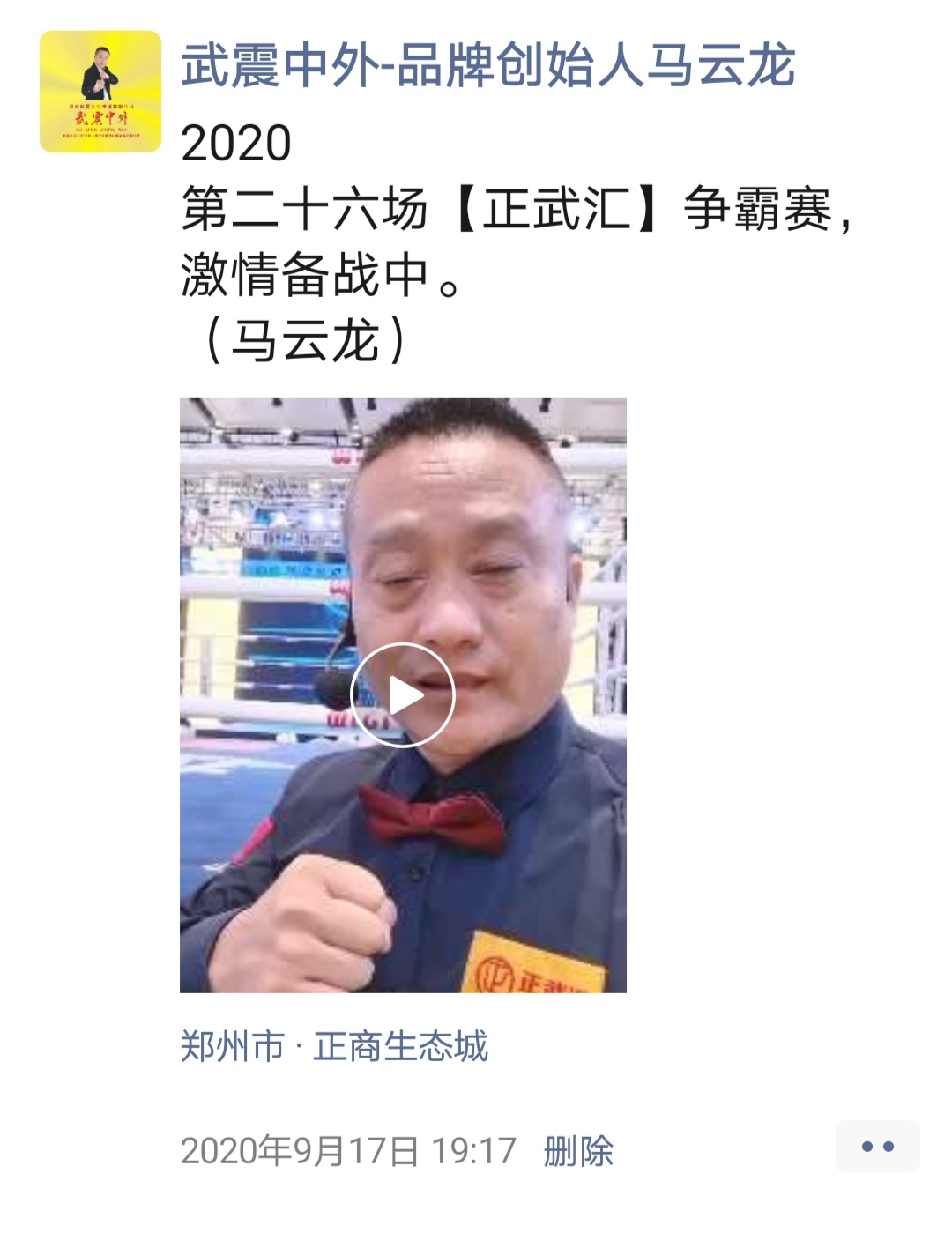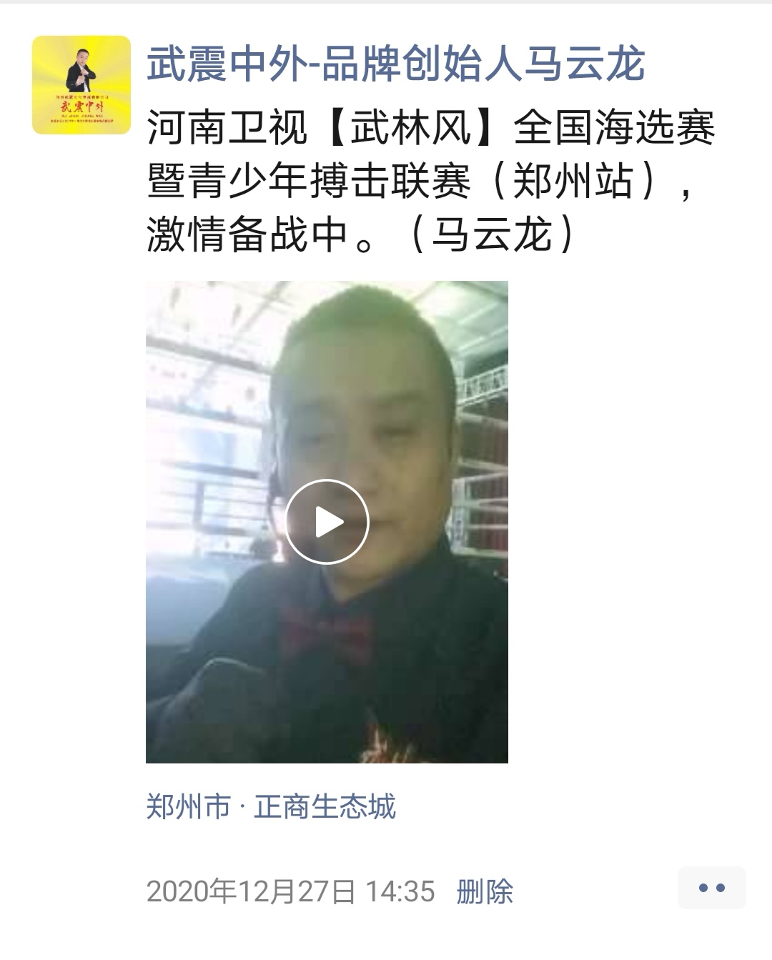 如:【武震中外】品牌创始人马云龙,除了本公司的工作之外,也积极参与国内其它品牌赛事,作为各路品牌各地赛事的裁判一员,从2019年5月至2020年12月之间,马云龙陆续参与执裁各路品牌赛事,已达三百三十场左右,参与执裁每地举办的赛事时,马云龙都很珍惜宝贵的精彩瞬间而及时的记录着,精彩回顾,如图: