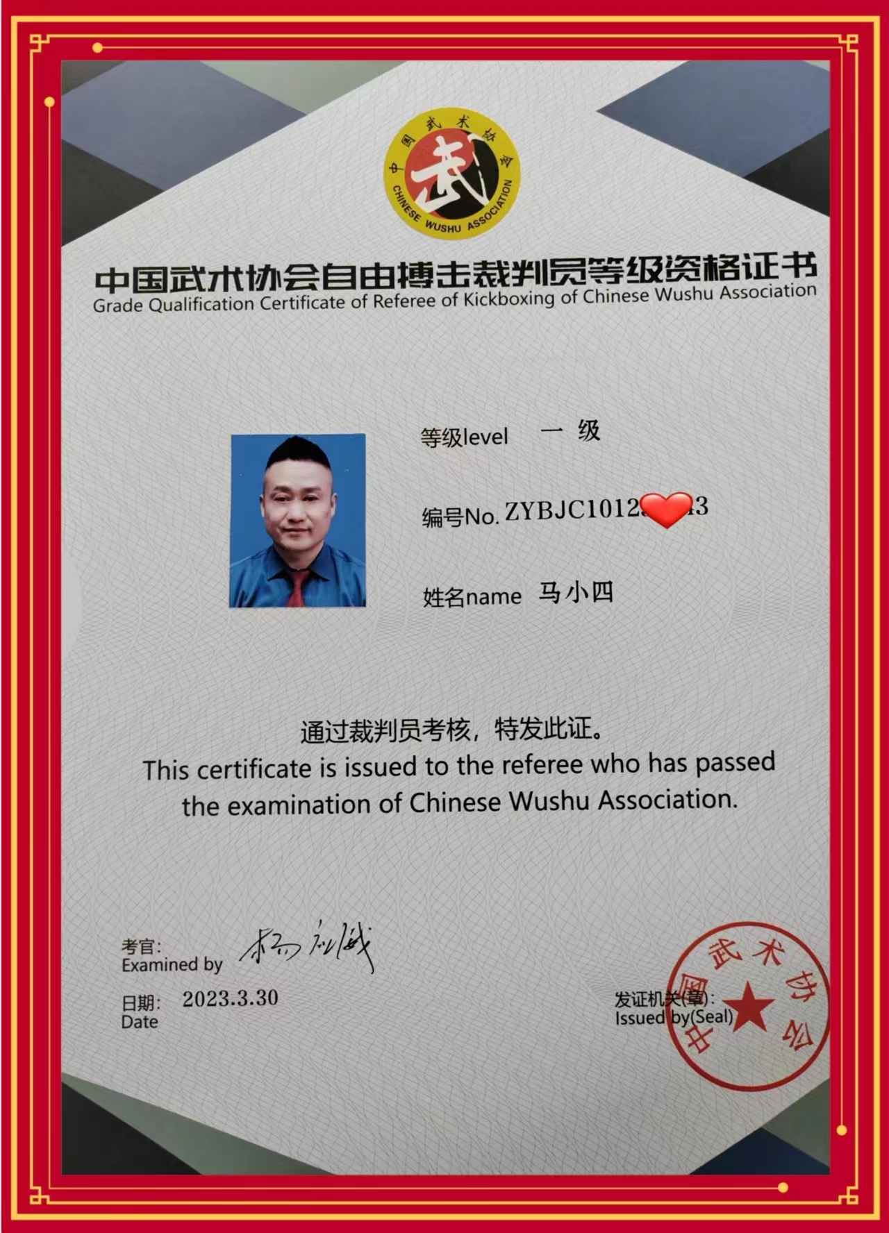 3月30日,通过2023年全国自由搏击裁判员培训考核,马小四(大名:马云龙)荣晋中国武术协会自由搏击一级裁判员;